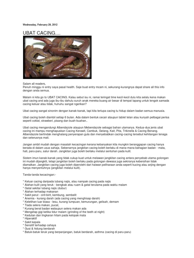 ✅ penyebab, ✅ cara daftar isi. Cara mengelakkan simptom ini daripada menjadi teruk adalah dengan melakukan pembasmian cacing menggunakan ubat yang kebiasaannya boleh kesan ubat yang optimum sukar didapati jika anda masih tidak memasak daging dengan baik, tidak mencuci tangan sebelum makan dan berkaki ayam. Makanan yang sudah dicerna oleh cacing akan dikeluarkan menjadi kotoran. Tetapi ada juga dalam kalangan ibu bapa yang masih tidak pasti perlu dan waktu bilakah yang sesuai. Dos ubat yang perlu diambil adalah 10ml(rujuk panduan aturan akan dos ubat).